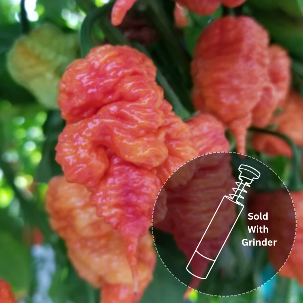 Description: A formidable cross between the Naga Bubblegum Red and Naga Viper peppers. The pods exhibit a color journey from light green to peach, orange, and finally red, with a distinctive bumpy, wrinkled skin. The flavor is floral and fruity with citrus undertones, delivering an intense, lingering heat.