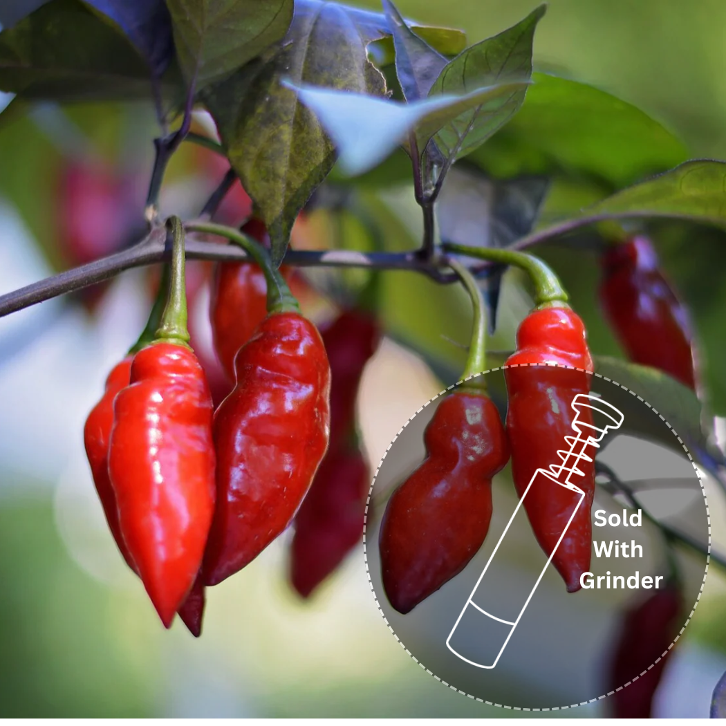 Description: A manual cross between Jay's Pink and Pimenta De Neyde peppers, resulting in a plant with dark purple stalks and foliage. The 2 to 3-inch pointed pods transition from black to purple, finally ripening to bright red. Expect intense heat with a slightly bitter aftertaste, making it ideal for hot sauces or chili powders.