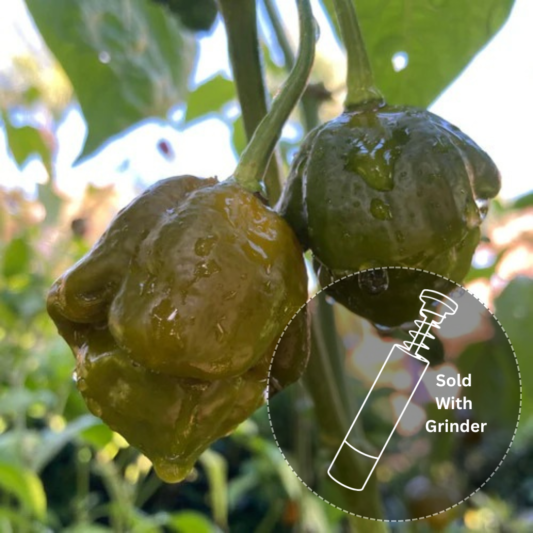 Description: This unique pepper resembles a cross between a Mustard 7 Pot and an Apocalypse Scorpion. Pods start green, ripening to a yellowish-green, similar in size to other 7 Pot varieties. They offer a sweet, fruity flavor profile, with interiors rich in capsaicin. Perfect for crafting spicy green salsas or hot sauces.