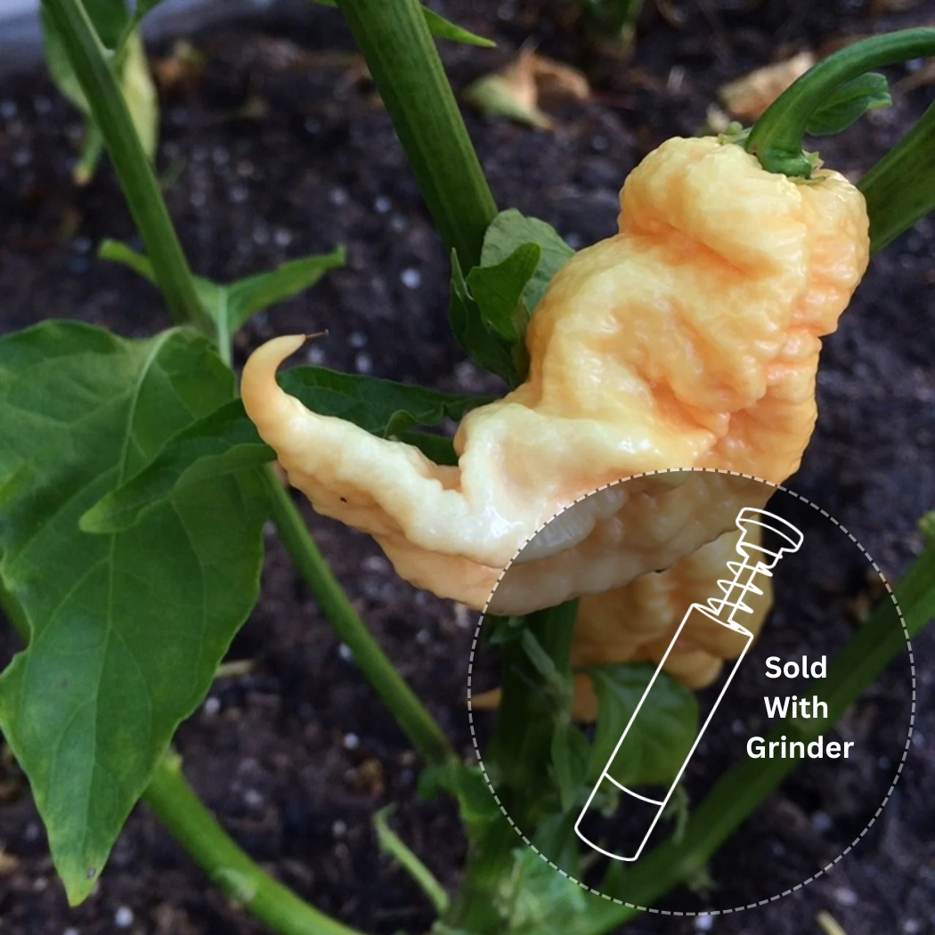 Description: A cross between Apocalypse Scorpion & Jay's Peach Ghost Scorpion, resulting in prolific plants producing stubby, blistered pods with thin skin. The flavor is fruity with a nutty finish, leading to an intense, enduring heat that commands respect.