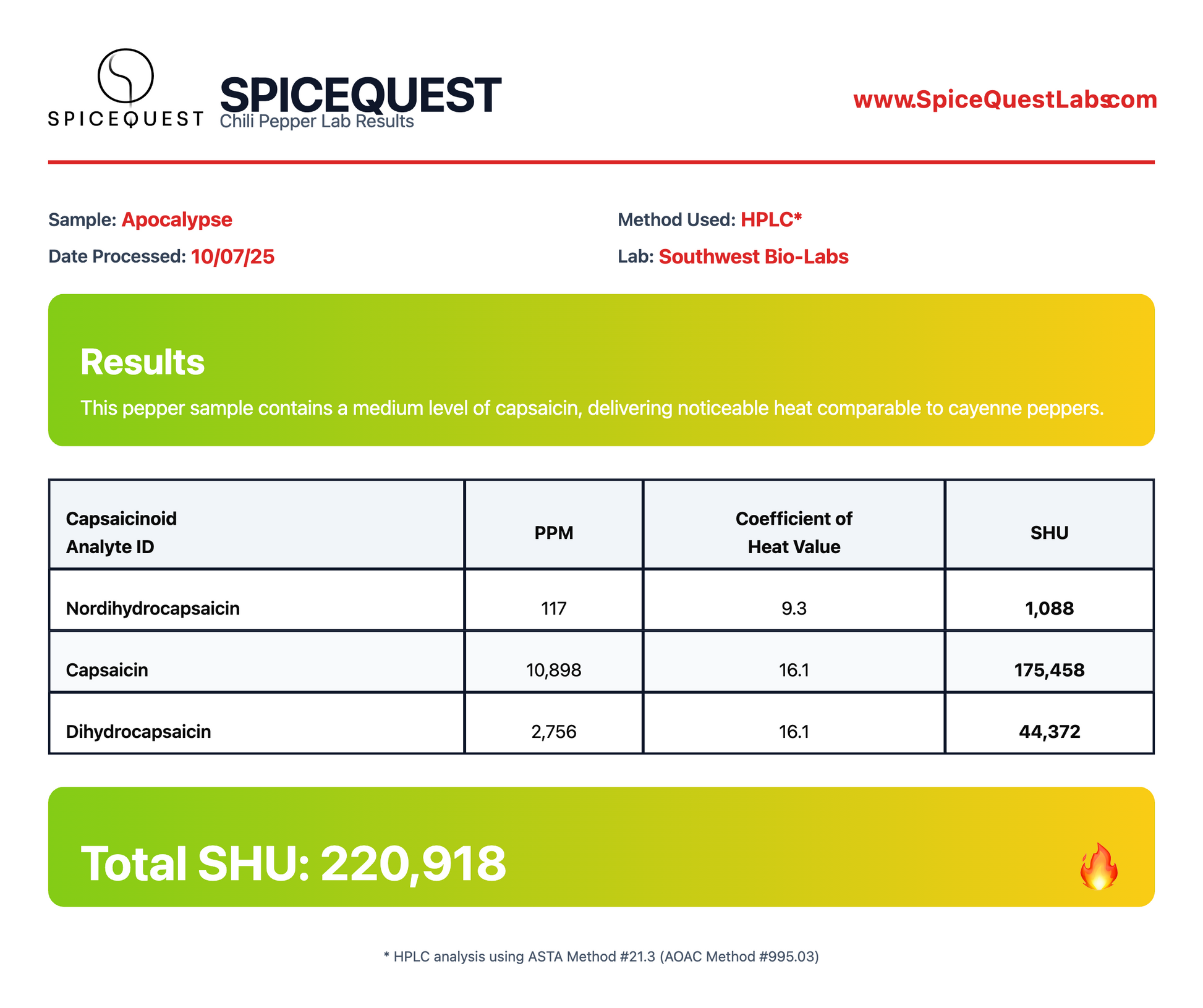 Lab-tested at 220,918 Scoville Heat Units, the Apocalypse Scorpion opens with a clean chinense fruit note before the heat begins to rise. The burn is steady and confident rather than explosive, settling into a warm, persistent glow that stays on the lips and back of the throat.