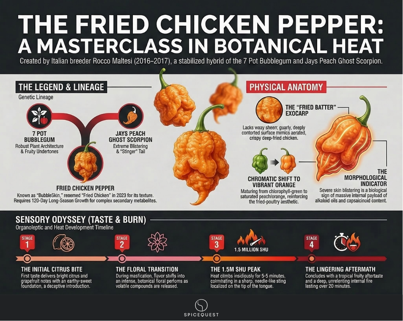 The Fried Chicken pepper was developed by Italian master breeder Rocco Maltesi, whose earlier creation — the Gator Jigsaw — helped define the mustard superhot phenotype. Between 2016 and 2017, Maltesi crossed the 7 Pot Bubblegum (BBG7 Orange) with the Jays Peach Ghost Scorpion (JPGS), originally calling the result "BubbleSkin" for its deeply contorted exocarp.