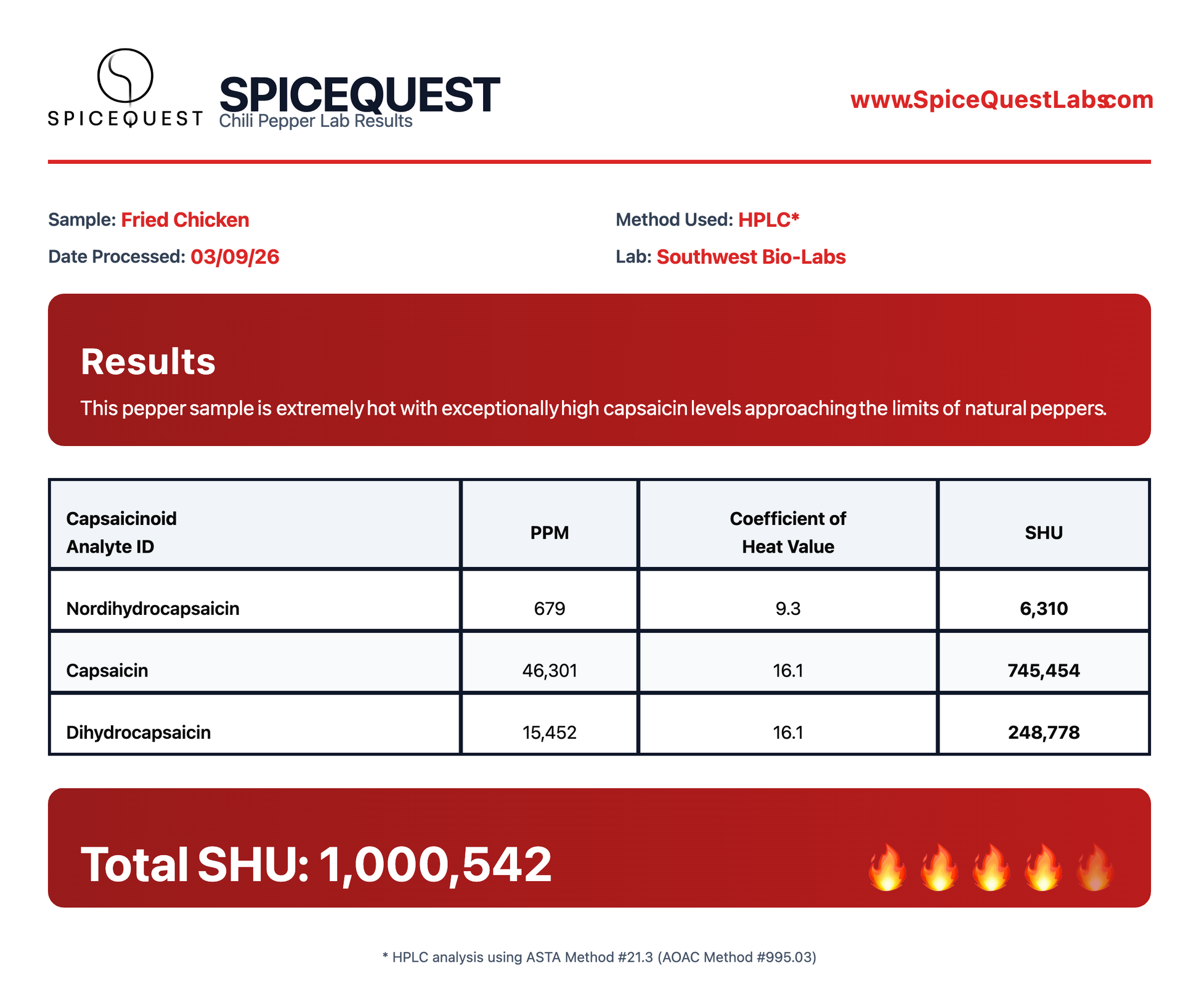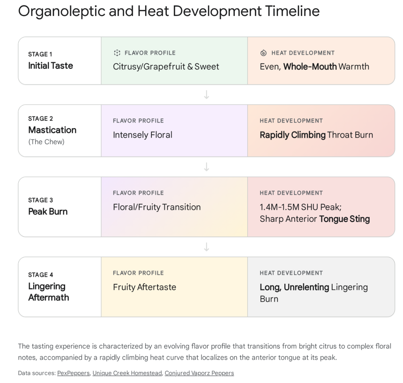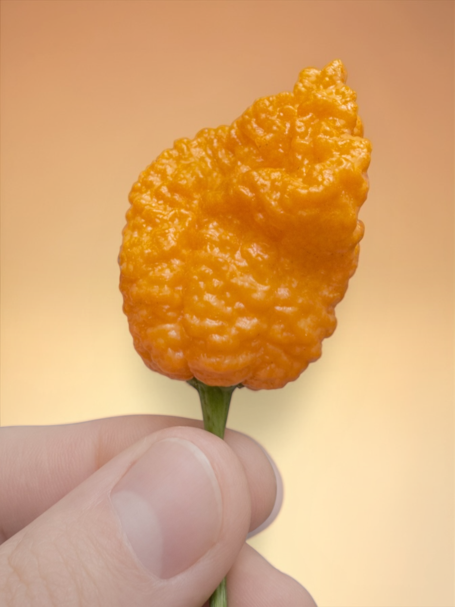 This pepper lab-tested at just over 1,000,000 SHUs. Estimated between 1.3 and 1.5 million Scoville Heat Units. The Fried Chicken opens with a burst of bright citrus — grapefruit-forward, almost tropical — before a deep, permeating floral note takes over mid-palate. A subtle earthy sweetness inherited from its 7 Pot Bubblegum parentage keeps the whole experience from tipping into pure chemical aggression.