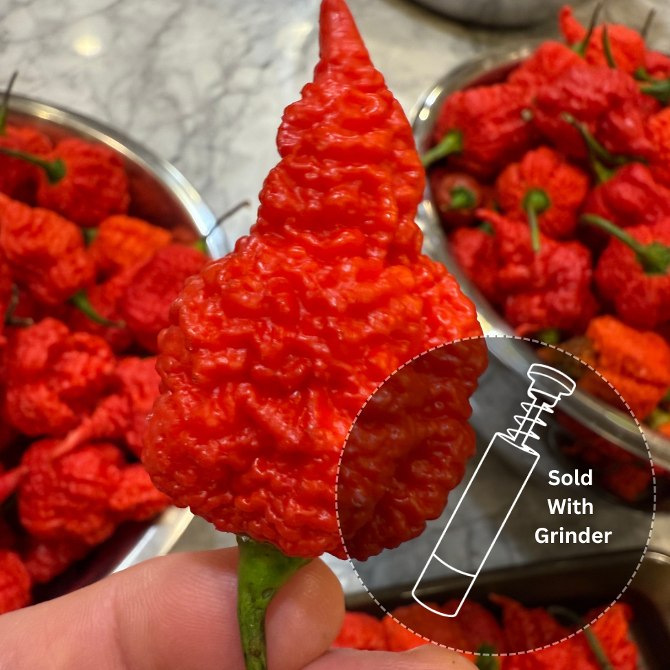 Welcoming back the renowned RB003 Pepper for a second year — a formidable fusion of heat and flavor that commands attention. This superhot variety, meticulously bred by Australian grower Ross Barber, is a cross between the Carolina Reaper and the 7 Pot Brainstrain. The result is a pepper that not only delivers an intense, fiery heat but also offers a depth of flavor that will elevate your culinary creations.