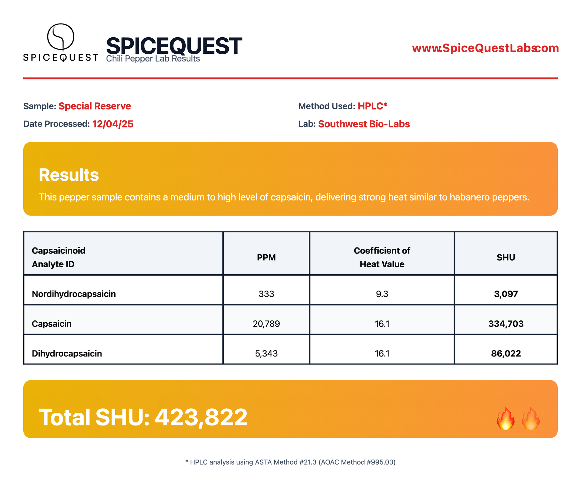 Heat Level (lab-tested): 423,822 SHU (Medium-Hot to Hot — 5 to 6)